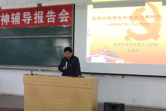 会议邀请马克思主义学院王勇军博士作了题为《走进中国特色社会主义新时代——中国共产党十九大精神》的专题报告。王勇军博士围绕十九大报告的主题、框架、创新对十九大精神进行了全面阐释和系统讲解。王勇军博士在报告中指出,学习贯彻十九大精神,重点是要牢牢把握和深刻理解党的十九大报告的鲜明主题,深刻领会习近平新时代中国特色社会主义思想的历史地位和丰富内涵,深刻认识五年来党和国家取得的历史性成就,深刻认识中国特色社会主义进入新时代和新时代党的历史使命,深刻理解我国社会主要矛盾的变化,深刻理解实现“两个一百年”奋斗目标的战略部署,深刻认识坚定不移推进全面从严治党的重大意义,进一步坚定“四个自信”,进一步增强“四个意识”,努力推进新时代中国特色社会主义伟大事业新发展。