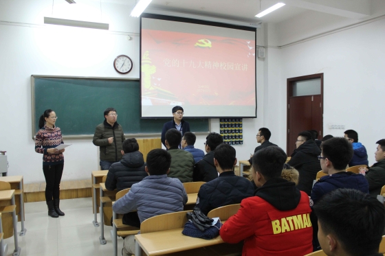 本次报告会由辅导员宋立军老师主持召开,纪建茂老师和靳雪银老师分别发表讲话。宋老师首先介绍了本次报告会的目的和意义,然后靳老师进行了党的十九大精神宣讲。靳老师结合ppt对党的十九大精神进行了深刻解读,并强调不忘初心,牢记使命,高举中国特色社会主义伟大旗帜,把党的十九大精神弄懂、弄通并落实到实际是我们的首要任务,我们要以党的十九大精神为引领,与祖国和时代同行,把个人的青春梦想融入到实现中国梦的伟大事业中,砥砺奋进,不负使命。与会人员认真听讲并做好记录,纷纷表示要把党的十九大精神落实到实际生活中去,起到模范带头作用。
