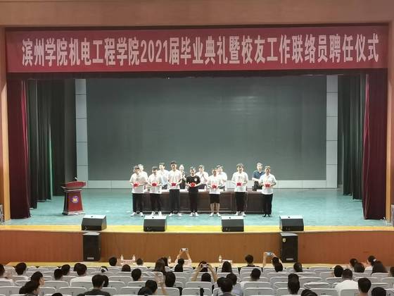 6月20日上午10点,机电工程学院于千人礼堂举行了2021届学生毕业典礼暨校友工作联络员聘任仪式。滨州学院合作发展处处长赵书杰,机电工程学院党总支书记王丕琢,院长李宏伟,党总支副书记王春磊,副院长章健,学生科科长宋立军以及部分教师代表、辅导员出席仪式,毕业典礼由副院长黄爱芹主持召开,2021届全体毕业生参加。