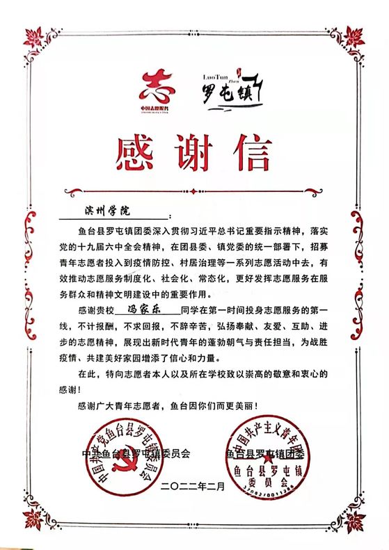疫情防控正值寒冬腊月,天气格外寒冷,但在鱼台县罗屯镇的志愿服务站,却总能看到冯家乐同学忙碌的身影。面对基层防控千头万绪的工作,作为一名有使命担当的大学生,他决定用行动贡献属于自己的一份力量。在村委干部的带领下,一起做好疫情防控值班,为进出村居的居民进行温度检测,严格管控车辆出入,进行挨家挨户的摸排,参与务工返乡人员的隔离和核酸检测工作;挨家挨户进行核酸检测登记,工作一丝不苟,实现核酸检测登记全覆盖。同时也积极建言献策,为村居工作注入了许多新思路、新想法,得到了当地政府的高度赞扬和肯定。为此,鱼台县罗屯镇政府还特地给寄来信函以表感谢。