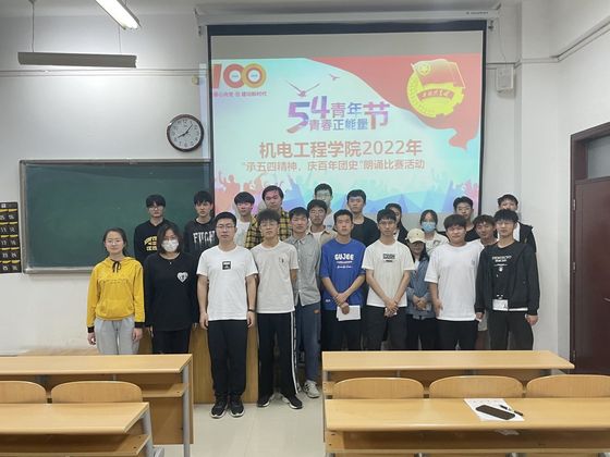 为弘扬“爱国、进步、民主、科学”的五四精神。5月2日,机电工程学院于八教114教室举办“承五四精神,庆百年华诞”朗诵比赛。此次比赛由机电工程学院文体部组织举办,辅导员刘云龙老师担任评委,21级部分学生参加。