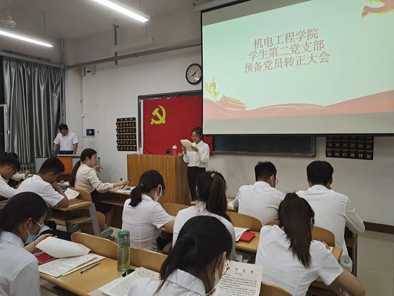 2022年5月31日晚7点30分,机电工程学院于八教101召开预备党员转正大会,会议共有第一党支部54名支部成员参会,其中正式党员23人,预备党员31人;第二党支部33名支部成员参会,其中正式党员10人,预备党员23人。此次会议由学生第一党支部书记韩娇娇,学生第二党支部书记刘云龙主持召开。