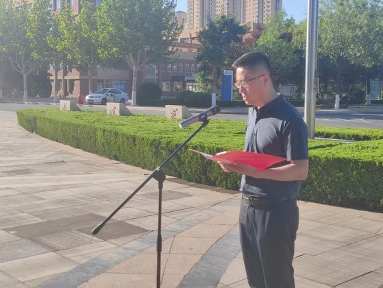 升旗仪式于6: 40准时开始,旗手们迎着朝阳,以饱满的热情,庄严地护卫五星红旗。当雄壮有力的《义勇军进行曲》响彻了整个校园时,全体同学集体行注目礼,全场弥漫着一种庄严肃穆的气息。鲜艳的五星红旗冉冉升起,激发了所有同学不断向上的斗志,点燃了同学们强烈的爱国热情。升旗完毕后,优秀毕业生代表丁宁做“青春绽放,梦想起航”国旗下讲话,随后,由李辉副院长致词,对同学们寄予了深切的希望,希望同学们要加强思想学习,增强敏锐性;要学会感恩,勇于担当;要能经挫折、抗打击;要胸怀理想、勇往直前,成为德才兼备的社会主义建设者和接班人。最后,毕业生党员王传哲领誓,向着五星红旗许下青春诺言。