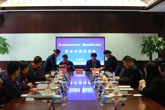 在山东创新金属科技有限公司,创新精密人力资源部部长王亮带领王春磊一行人参观了公司园区,随后举行了校企洽谈会。洽谈会上,创新金属副总经理吴胜利介绍了公司的发展历史,分析了进一步推进合作的发展领域,双方就“当前用人单位需要什么样的人才?”等问题展开了讨论,同时双方就进一步推进实习就业、人才培养、科学研究等方面的合作,进行了充分交流。王春磊表示,高校作为人才培养和服务社会的机构,需要企业的深度参与才能在高水平专业群建设、实习就业、人才培养、产业学院建设等方面实现高质量发展,希望此次来访进一步深化合作,打造校企合作的样板,为学院的跨越式发展注入新的力量。本次访企,双方达成就业实习基地签订意向,现场签订就业实习基地协议。